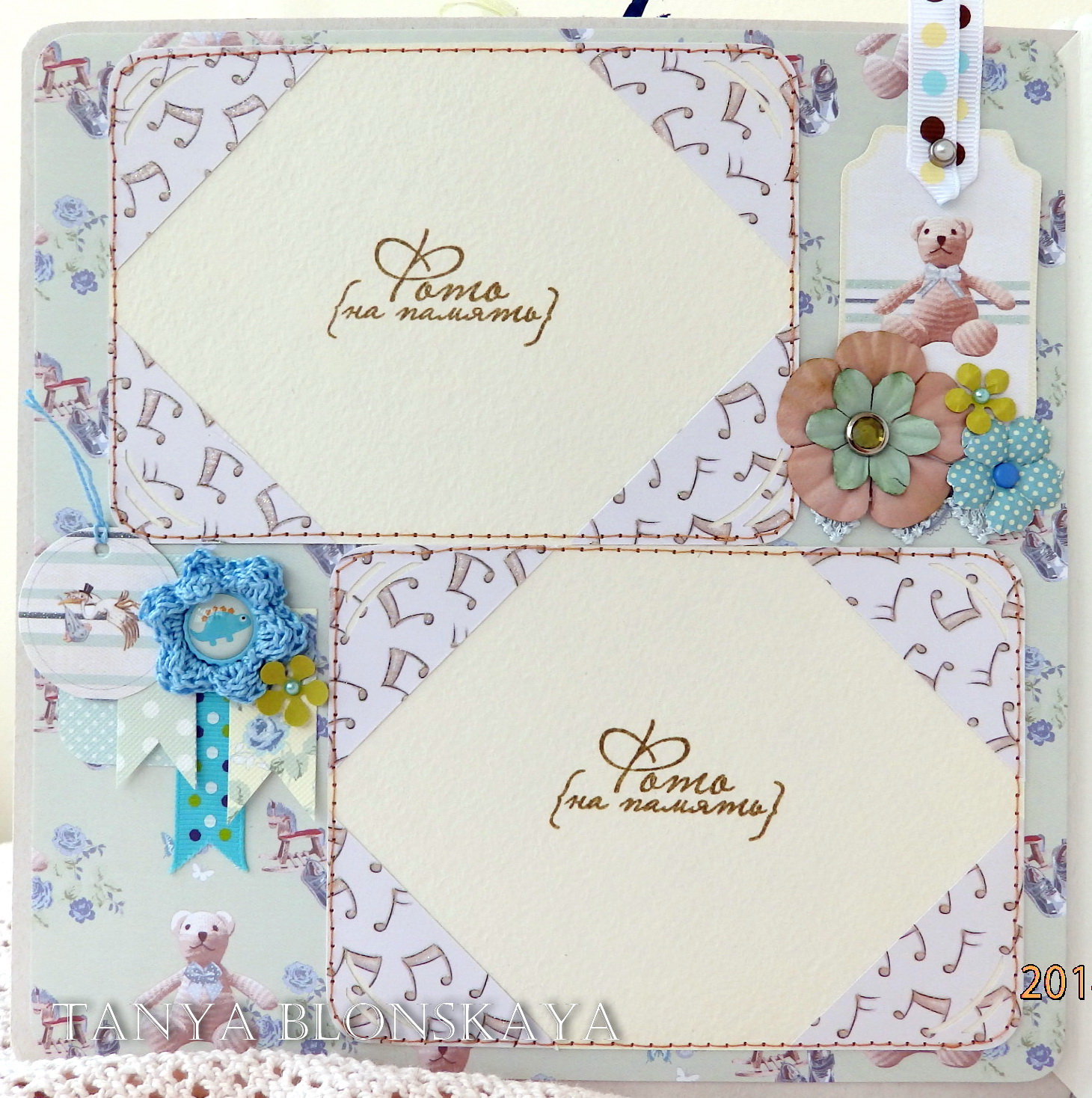 Для альбома выбрала чудесную бумагу "It's a boy"Это очень нежная и детская бумажка. А какая она текстурная и прекрасная на ощупь. Обложку сделала мягкую. Это один из самых быстрых моих альбомов. И необыкновенно нежный, на мой взгляд.